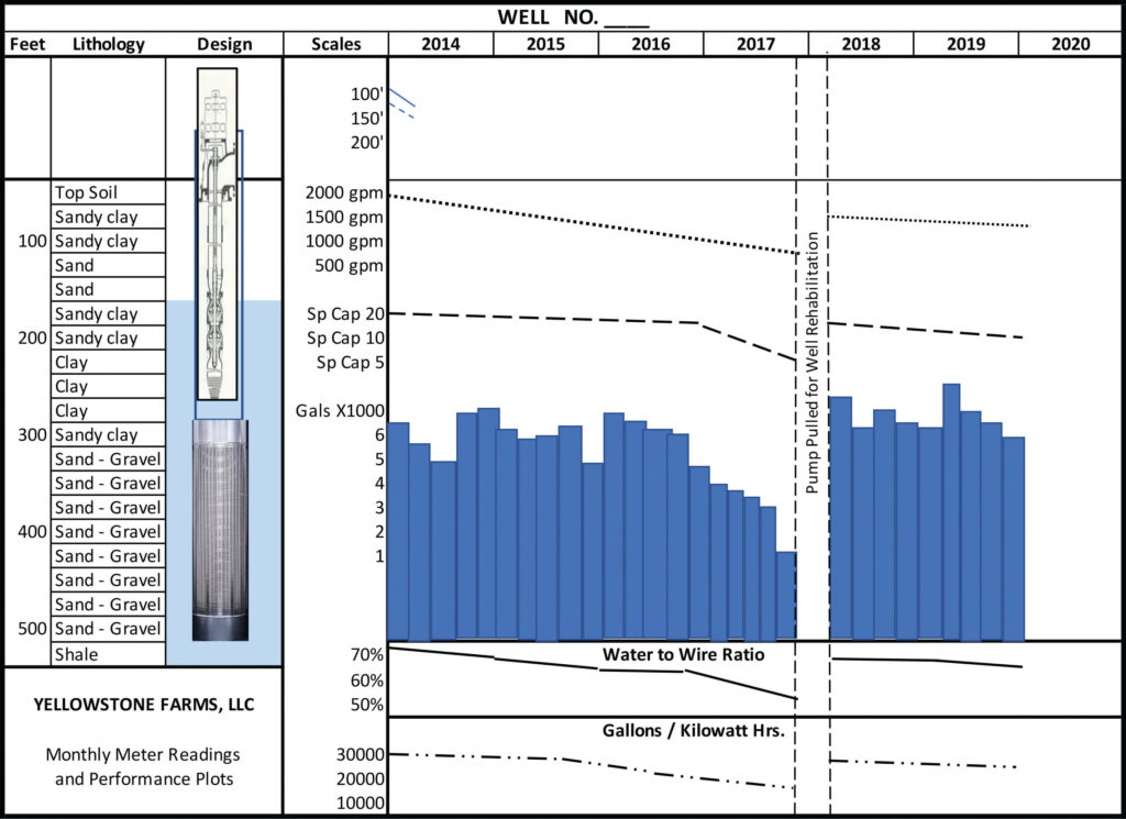 The third column contains scales for four important measurements taken periodically over the past six years. In late 2017 the pumping water level dropped significantly, the gpm fell off steadily as the specific capacity fell below 10 gpm/feet drawdown and the W/We efficiency approached 50%. At this point it would become clear to the farmer that it was time to pull the pump and rehabilitate the well. Doing a scheduled well rehabilitation or pump replacement in the offseason is preferable to performing one at a critical time in the growing season.