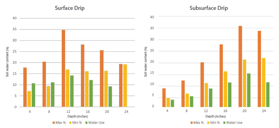 Figure 2 uses a bar graph to visualize soil water content at a vineyard near Benton City at the end of an irrigation event when water content is highest (orange) and just before the next irrigation event when soil water content is lowest (yellow), with the green bar representing the difference or amount of depletion or water use over the four-day period. The left-hand graphs show surface drip and the right-hand set are for subsurface drip with an equal amount of water being applied to both surface and subsurface at each site.
