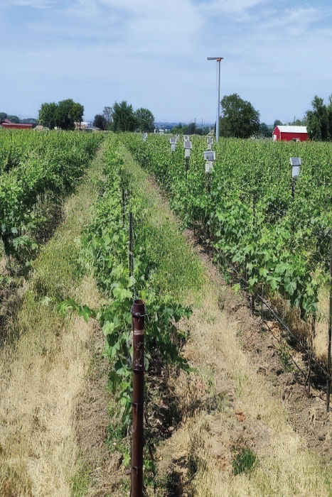 Based on results from two research sites in Washington State University near Benton City and Walla Walla, soil water content and soil water tension sensors provided the most consistent results when placed near the base of the vine. This placement location has also proven best for installation of tubular subsurface delivery devices owing to protection from mechanical weed control implements and practices.