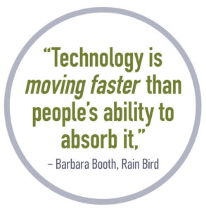 In addition, the responses indicate a consensus view that more training and workforce development for irrigators, water managers, irrigation system dealers, technology service providers and others is needed. “Technology is moving faster than people’s ability to absorb it,” noted Barbara Booth, vice president for microirrigation at Rain Bird.
